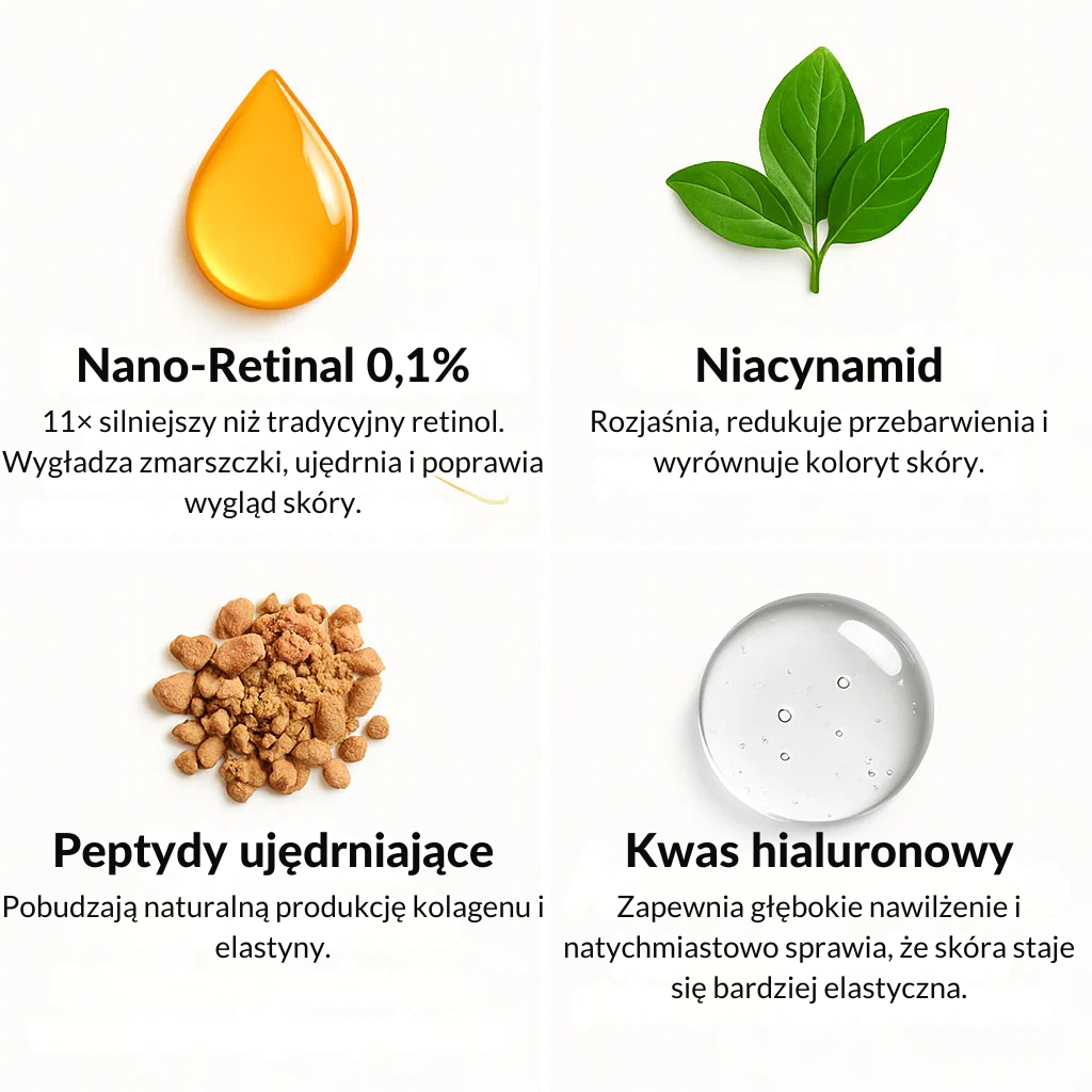Nano-Retinal 0,1% – zaawansowana i silniejsza forma retinolu, która pomaga wygładzić głębokie zmarszczki, ujędrnia i poprawia elastyczność skóry.